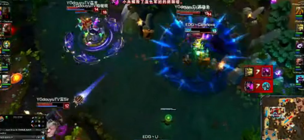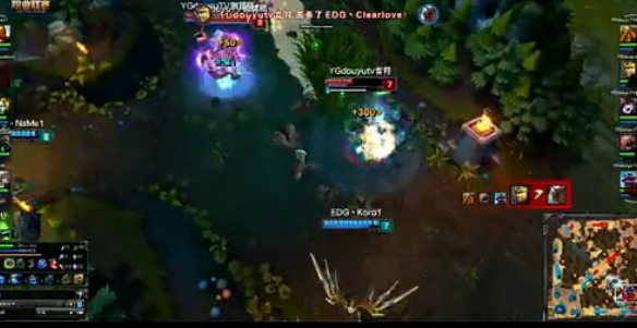 比赛七分钟,镜头一转来到上路,edg打野狮子再次出动出现上路,与adc老鼠一起越塔强打yg酒桶,厂长顶塔老鼠输出,最后老鼠一个e带走了逃生无望的酒桶。