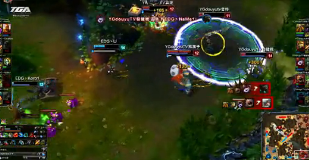 比赛十分钟,小龙刷新,双方十人聚集再此,edg狮子隐身开大,扑向yg人群,随后edg发条直接e到狮子狗身上,但是却被yg辅助布隆盾直接将球弹走,由于发条没有料到直接手快按出大招,导致直接空大,yg五见此人**** 疯狂突脸,yg皇子eqr三连带走可怜狮子狗,随后拿下小龙,一波零换一加小龙。从这场团战可以看出yg辅助的恐怖意识,临危不惧还能盾挡飞发条e,直接导致团战获得胜利。