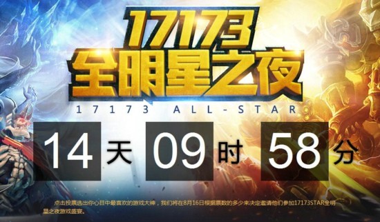 火热八月,激情的战役,闪耀的明星,17173全明星之夜火爆来袭!想看周宝龙同场演绎无情的杀戮吗?想看白龙马笑笑德云社专场的演出吗?票选你最爱的游戏大神,只要你敢投,我就敢来请!谁是2014最闪亮的游戏新星, 8月16日晚敬请揭晓!