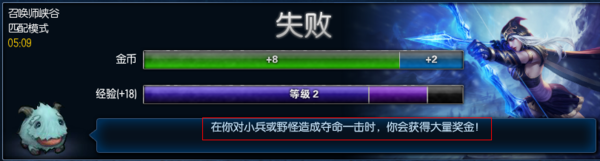 现在,新玩家将会时而在游戏结算界面看到一条提示,来介绍补刀的概念。