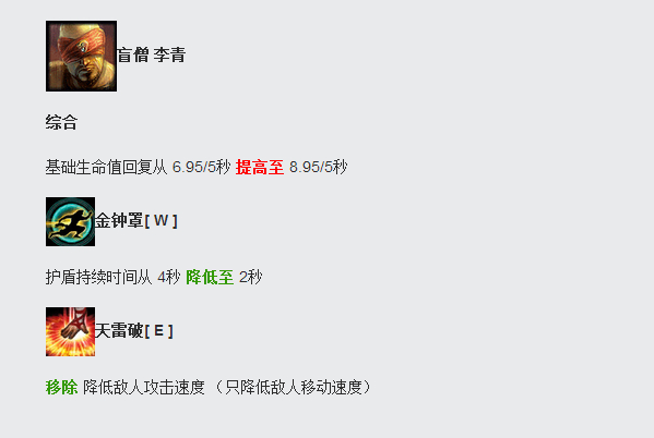 4.13版本拳头公司将魔爪伸向了盲僧坚挺的身躯和控制技能。盲僧可以在战斗中屹立不倒的金钟罩(W 技能),护盾持续时间从 4秒 降低至 2秒。降低降低敌人攻击速度和移动速度的天雷破( E技能)将不再降低敌人的攻击速度 。相对的,基础生命值回复从 6.95/5秒 提高至 8.95/5秒。