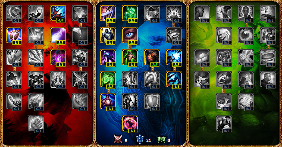 如果你认为对线的英雄对你没有什么大的威胁,用这一套12-9-9的天赋也是可以的,攻击系除了上面天赋的九点外,再点出死神加强对血量50%以下的英雄的伤害,在对拼时非常有用。防御系就点出前九点即可。然后点出九点通用系的移速,回蓝和减召唤师技能CD。移速在游戏全程都非常有用,大树的技能前期耗蓝非常严重所以点出回蓝还可以使前期蓝回复快一些。召唤师技能减CD每个英雄都需要。