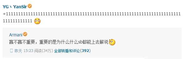 在YG和OMG的比赛中,YG又一次爆冷以2:0的战绩完胜OMG,然而比赛结束之后,YG领队梁晓龙(微博名Armani)却在微博发出了这样的言论:"赢不赢不重要,重要的是为什么什么SB都能上去解说?"