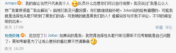JOKER也对这条微博进行了回复,说YG的人只听得见黑听不见夸。梁领队也指明:喷的就是黑我们的人!