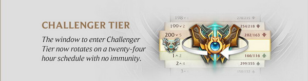 随着大师组的加入,我们已调整了玩家进入挑战者组的方式。现在,每隔24小时,只要玩家或是队伍有足够的点数进入前200玩家或是前50名队伍,那么就能够进入挑战者组。不处于前200名的玩家,将会被降级至大师组。