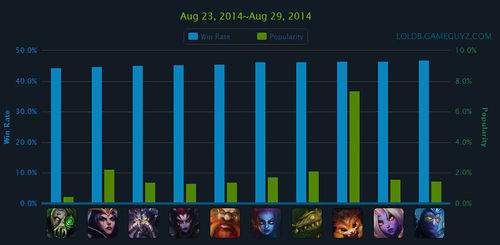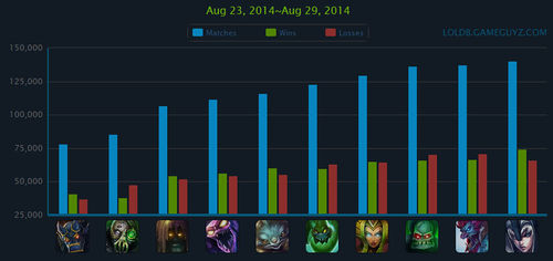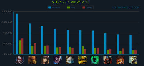 前六名无变化,机器人上升两名排至第七,嘉文四世、娑娜、斯维因离榜,入榜的是黑默丁格、蕾欧娜、迦娜。