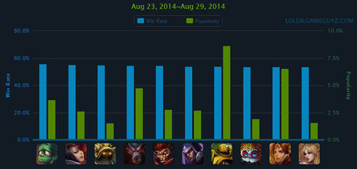 前一周最受宠爱的纳尔降到第九位,由薇恩取代其榜首位。盲僧、女警继续保持排名。曙光和狐狸离榜,入榜的是劫和剑圣。