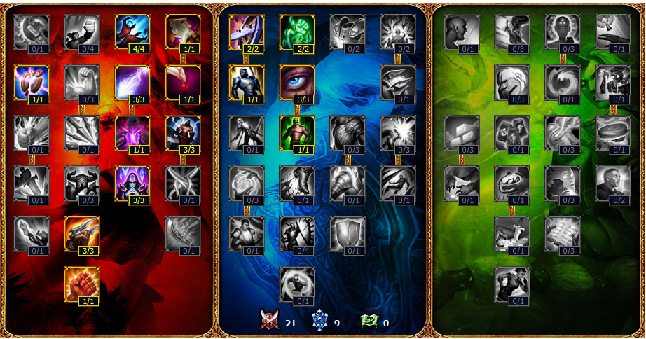 对线ap英雄就用这一套21-0-9的标准法师天赋,拉克丝没有回复技能,点出屠夫和盛宴既能方便补刀还能回血回蓝。因为拉克丝的技能都是aoe伤害,很容易命中很多人,所以点出洞悉弱点,可以增加队友的伤害。