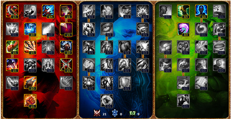 如果对线的英雄对豹女威胁非常小,可以用21-0-9这套天赋,这套天赋使豹女前期回蓝快一些,而且穿梭于草丛时的移速更快。还有减召唤师技能CD,这里不要点出buff持续时间,因为我们是上单,拿不到buff。