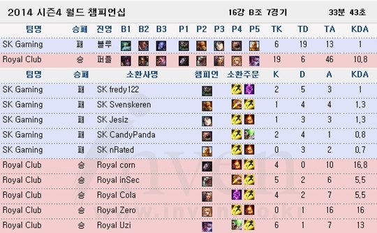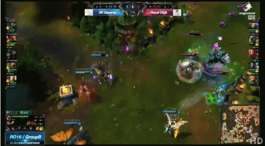 前中期的局势差不多,但是在小龙处的一波团战胜负格局发生变化。Corn的发条在团战时总能正确的施放大招(4杀 0死 10助攻)。Insec的雷恩加尔也很出色,而Zero再次选择的风女也表现活跃。Cola的刀妹成绩也算不错。比赛越进行,皇族的实力发挥的也越来越好。