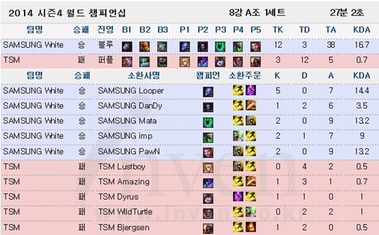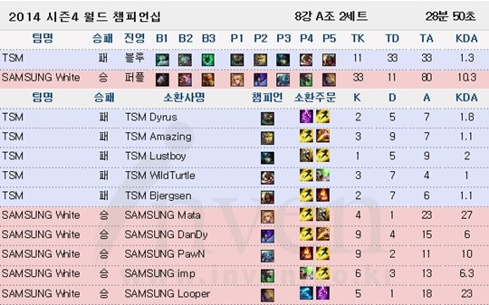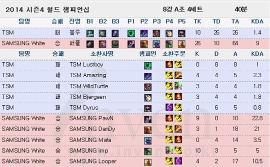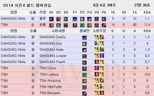 这次三星White集中攻略Bjergsen。从初期就不断压迫中路,为PawN的发育创造了很好的条件。TSM为了应对,开始了他们的偷塔战术,这也成功的动摇了三星White。明明TSM也很有机会的,但是三星White还是通过安稳的运营成功的进入了四强。其中,Imp在世界总决赛拿到了第2次的五杀。
