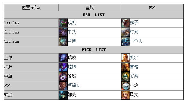 下面是2014世界总决赛八进四比赛,中国皇族对阵中国EDG的第一场比赛战报,以下是双方BP情况: