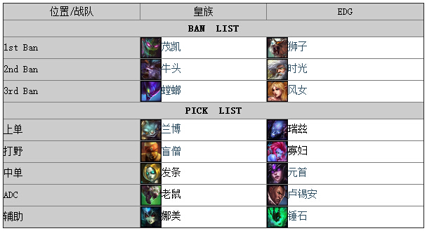 下面是2014世界总决赛中国皇族对阵中国EDG的第三场比赛战报,以下是双方BP情况: