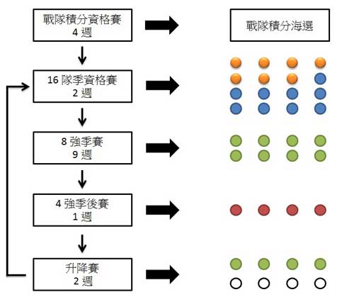 季后赛采冒泡赛方式进行,三四名交手后的胜出队伍,将和第二名的队伍交手,两队当中获胜的队伍则和季赛第一名队伍进行最后冠军赛,决定当季的季冠军。