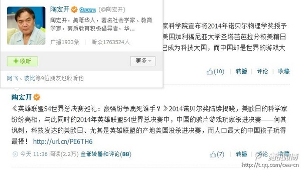 近日,伴随着英雄联盟2014赛季全球总决赛的火热进行,这次世界总决赛也受到了社会各界越来越多的关注,而“不甘寂寞”的陶教授也在此时发表了自己的一番评论。