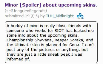 该网友从其一位兄弟口中得知冠军希瓦娜、收割者索拉卡以及终极皮肤的消息,而其兄弟的消息来源则是某位拳头员工。