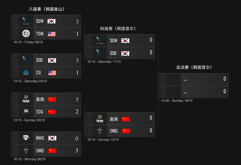 英雄联盟2014赛季全球总决赛已进入白热化的半决赛阶段,会师釜山的八队经过激烈的角逐,由OMG、皇族、SSW和SSB四支战队晋升四强。无独有偶,四强后中韩两国不仅要各自内战,并且决赛两国最强战队也会在总决赛上一决雌雄,这同去年惊人的相似,希望此番中国代表队能有新的收获。10月11日和12日的16点,半决赛之战即将打响。