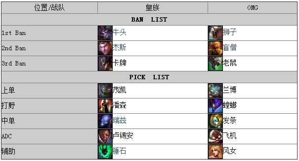 下面是2014世界总决赛 中国 皇族对阵 中国 OMG的比赛战报,以下是双方BP情况: