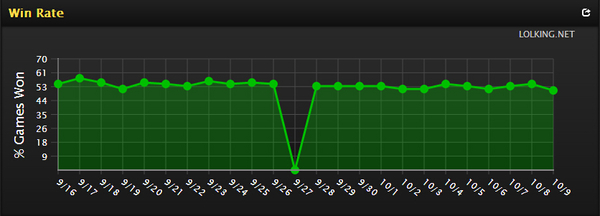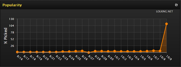 9月16号开始,塞恩的出场率就仅仅只有不到3%,出场次数也不到500次。9月27号更是达到了0%。没人选塞恩这个英雄。直到10月9号,塞恩的出场率达到了恐怖的111%,出场次数更是达到了27580场。