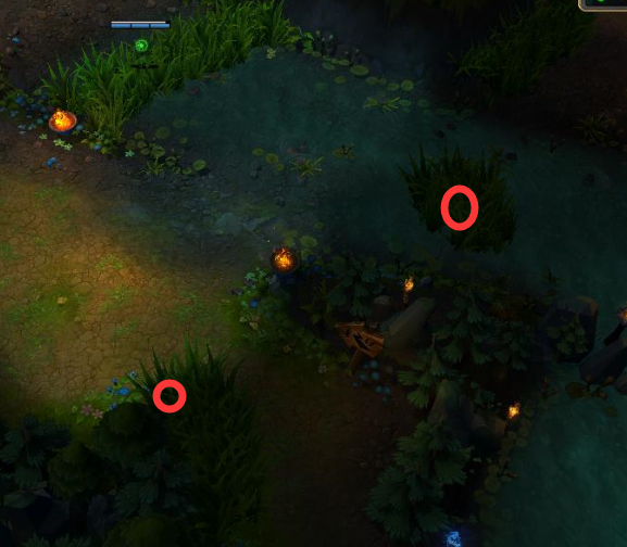 但如果选择卡特小鱼人这种近战,被对方的远程中单压的太厉害,那么选择下图的草丛做眼也是不错的,我方打野很强势的话,那么同样是3:00在此处做眼,让打野发育刷野到3级,带着双buff来gank,毕竟兵线被压制,逼得对方中单交出召唤师技能还是很轻松的。