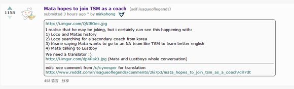 本网最新消息,reddit有网友发布了一篇文章,介绍了SSW在S4总决赛的人MVP,刚刚宣布离队的辅助选手Mata和TSM队内辅助选手Lustboy的聊天记录,很可能预示Mata将以教练身份加入北美战队TSM。
