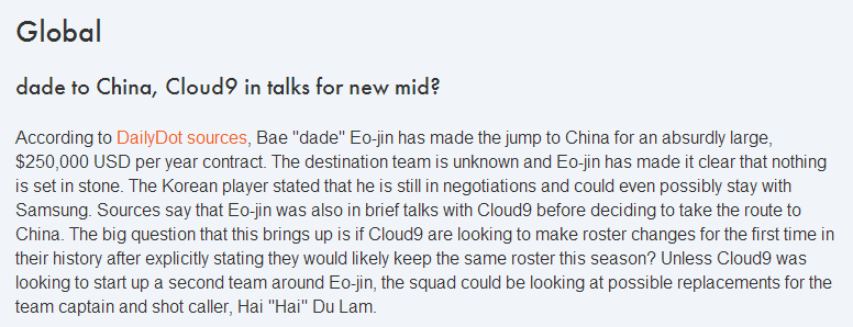 Dade极有可能会去中国,而且合约价值25万美金。Dade本人表示目前还是未知数,不过也有可能会留在三星。之前传言他在决定去中国之前一直在与C9接触,如果这样,C9不得不驱逐队长---Hai掌门,并且围绕dade建立一套战术体系,这貌似不大可能吧。