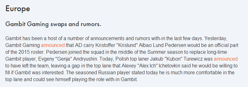 这支前M5战队最近剧烈动荡。他们引入新ADCKristoffer "Krislund" Albao取代欧洲知名选手Genja。Alex Ich表示只要Gambit愿意,他愿意补充前波兰选手 Jakub "Kubon" Turewicz 出走留下的上单空缺,其实他在上单位置感觉更舒服。
