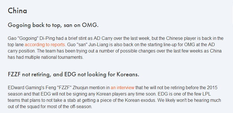 EDG的卷毛在一次访谈中表示他不会退役,将一直待到2015赛季,EDG也不会招募韩援,他们也是LPL里很少与韩援传出绯闻的队伍之一。