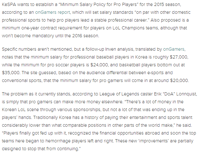 现在的问题是,选手们有机会去别的地方挣大钱。“韩国LOL里有很多赞助,但是这并未进入选手们的腰包里”Erik “DoA” Lonnquist(知名Ongamer赛事评论员)表示。传统上,韩国人赚到的比其他赛区同水平选手要少的多,选手们对此很不满这点,他们有大把机会去海外淘金,俱乐部也会因此支离破碎。所以最低工资的规定针对目前韩国战队流血颓势而制定的。