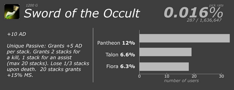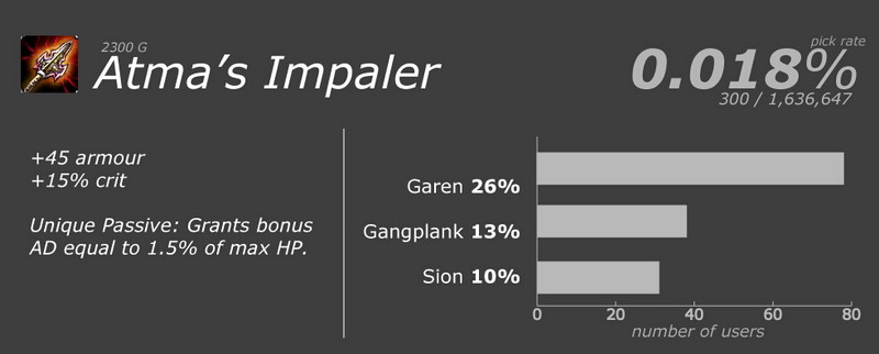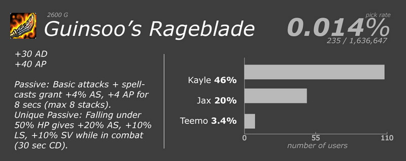 点评:能从这件装备中完全受益的英雄比较少,因为它所加成的属性是既有AD又有AP,同时还有攻速,这样苛刻的条件,也就只有凯尔和贾克斯之类的英雄可以物尽其用了。