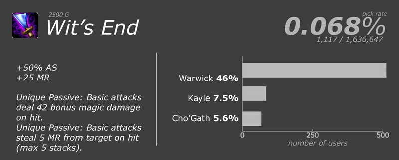 点评:在对付拥有生命回复能力的英雄时,这把武器是挺有用的,比如斯维因、沃利贝尔、或者是很肥的蒙多。但ADC基本不会看上这件装备,其他装备在拥有同样效果的情况下,还能输出更多的伤害,比如破败。而大部分队伍也都会带引燃,这也起到了同样的效果。