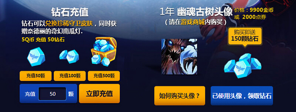 你可以通过在游戏商城内购买【幽魂古树头像】,然后即可收到150颗钻石。或者用q币充值钻石哦。(5q币充值50钻石)钻石可以兑换眼位皮肤还有南瓜灯。南瓜灯就可以抽取皮肤了哦!