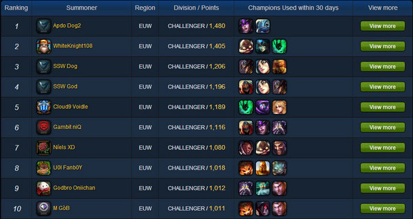 西欧服务器的排名中目前占据排名第一的则是SK战队的丹麦教练Incarnati0n(关于这个ID和Pobelter的情况一样),而第二名则是欧洲高分路人大神,第三名和第四名则是H2K战队的中单Febiven的两个号(小编被这些账号看晕了),欧服整体情况差距都不大,包括第五的Voidle和第六niQ都还是很有希望的。