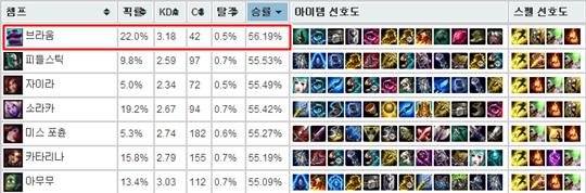 最基本的技能组合非常完美,所以取得好成绩也是理所当然的事情。布隆在单排中不仅是辅助最强,在所有英雄中也是最强。登场后不久就占据了胜率第1的宝座。