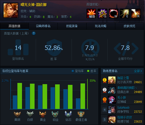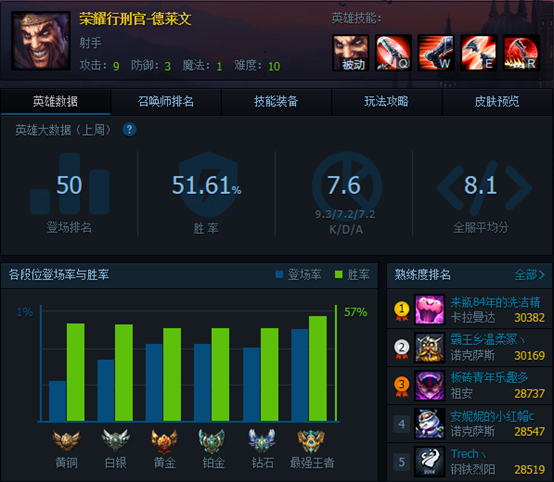 德莱文的英雄熟练度最高同样达到了3W以上,这说明这名英雄是非常值得练习——并且能够很大的训练潜力的英雄。而日女的操作则相对比较简单,同样也因为作为一名纯坦克型的辅助,其全服平均分并没有太高。