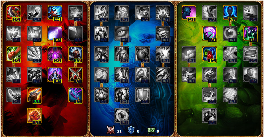 小胖用的这套天赋也是很拼很凶的天赋,首先点出了双刃剑,众所周知双刃剑这一点天赋对于近战英雄来说性价比很高,但是对远程英雄加成并不高,但是小胖就是凶,就是为了提升伤害,自己本身脆点没关系,很自信。而且从天赋可以看出小胖的妖姬是很喜欢技能结合普攻打伤害的,因为他点出了第一个编织和奥术之刃这两点天赋。而妖姬作为一个需要近身的刺客英雄,危险游戏这一点还是很重要的,击杀后瞬间回血回蓝,很多时间会就你一命。而通用系就是最基本的九点,回蓝很重要,然后减少召唤师技能时间和buff持续时间。
