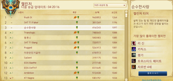 今日小编在登录韩服“抗韩”的时候,在匹配其他玩家的空余时间查了韩服最强王者的排位(韩服就一个服务器)。意外发现厂长已经跻身三甲。