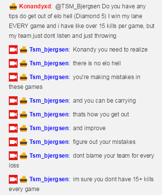 近日小编在看Bjergsen直播时看到一位粉丝问Bjergsen,他在钻石5,怎么才能冲上去,他说他对线把把都能打赢,每局可以杀15个以上,但是队友就是不听他也会去送。Bjergsen给出的建议是:“兄弟,你得明白,没有什么守门段之分,只有你自己不够强,只有你carry比赛,这才能让你出坑,提高。你得总结自己的失误,不能输了总埋怨队友。我相信你肯定每局也杀不到15个”。