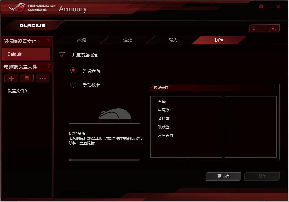 表面校准可以采用预设与手动两种校准的方式,从预设的表面选项可以看出大G几乎支持所有材质的表面甚至是桌面裸奔都不成问题。在实际测试中小编使用了桌面、赛睿QCK+的布垫以及复合纤维材质的剑匠疾风垫子一同进行测试,表现均非常稳定没有出现丢帧以及移动受阻等现象。