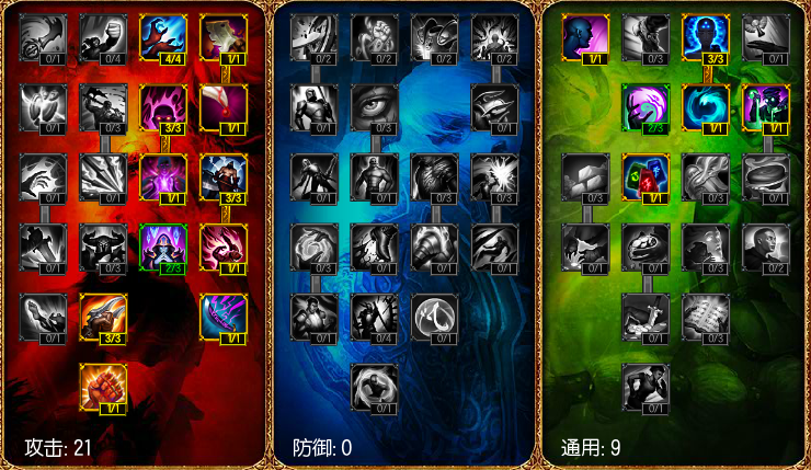 Nagne多使用的妖姬天赋是21-0-9的暴力天赋,妖姬是一个十分灵活的中单法师,想要再线上消耗到灵活的妖姬并不容易,因此9点的天赋点Nagne没有点在防御中,而是点在通用中,来增加妖姬的回蓝和续航能力,炼金精通一直是高端玩家非常爱点的天赋点,能够保证线上的续航。21点点在攻击中没有异议,窃法之刃能够在前期配合妖姬平A能够造成不错的消耗,死神天赋必点,最大化妖姬的收割能力。