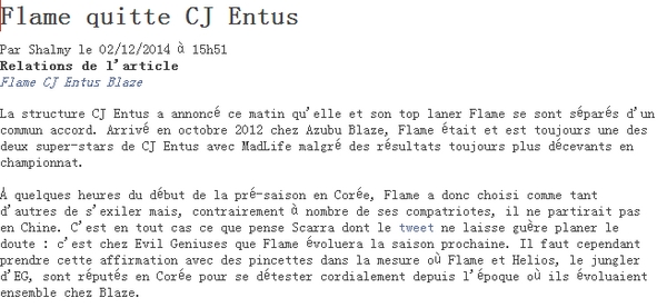 昨日,韩国上单Flame离开CJ俱乐部,法国Esports对此进行了报道,并且爆料了Flame可能加盟美国EG征战LCS的消息。