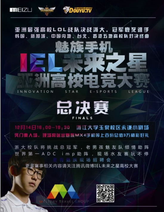 魅族手机IEL未来之星高校电子竞技大赛总决赛将于12月14日16:00,在浙江大学玉泉校区永谦小剧场正式打响,重庆邮电大学及西南大将共赴杭州争夺最后的荣誉,届时浙江大学也将派出校队共战巅峰。