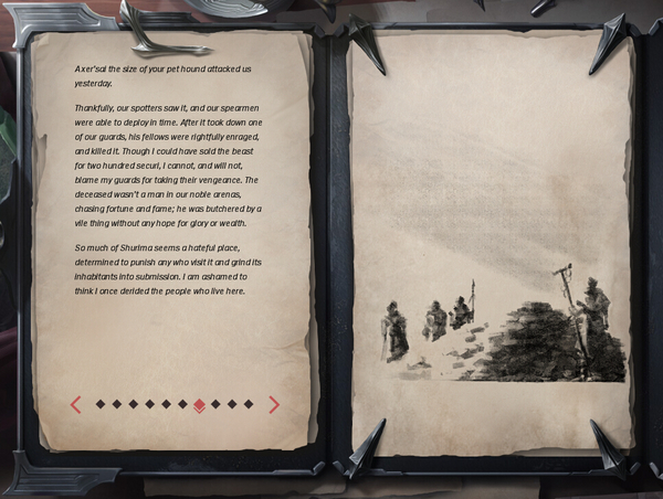 幸好,我们的观察员看见它了,并且我们的长枪兵们可以及时部署好。在它干掉我们的一个守卫后,剩余守卫都被激怒了,并杀死了它。尽管我只能把这头野兽卖个两百瑟库里币,但我不能,也不会,训斥我守卫们的复仇行为。死者不是在我们的高贵竞技场中的人,可以追求财富与荣耀;他被一个卑鄙的东西给宰杀,没有任何获得荣耀或财富的希望。