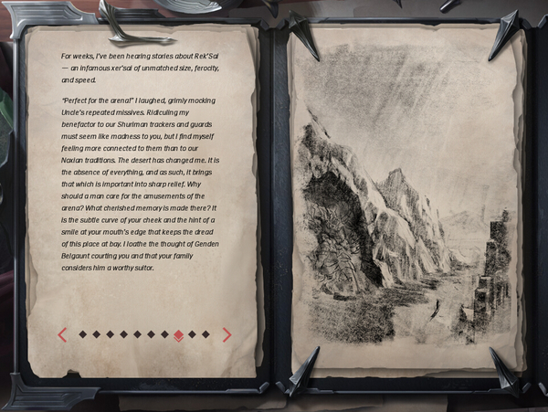“完美的竞技场野兽!”我大笑,冷酷地嘲弄着叔叔再三发来的信函。嘲笑那个资助我和我们的恕瑞玛纤夫与守卫的人,对你来说也许和疯狂没什么两样,但我发现与我们的诺克萨斯传统相比,我自己与他们更加贴近。沙漠改变了我。它什么都缺,同样地,它也让最重要的东西突显出来。为什么一个男人要关心竞技场的消遣之物?那里产生过什么可贵的回忆么?是你脸颊的微妙曲线和你嘴角的微笑暗示,让这个地方的恐惧感不再靠近。一想到根登•贝尔贡特在不断向你献殷勤,并且你的家里人还把他当成是富有的体面人,我就心生厌恶。