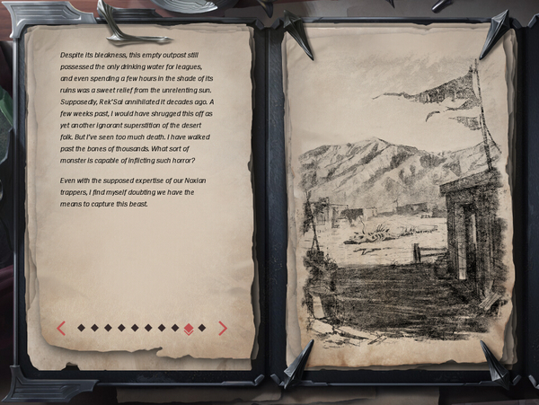 由于它的阴凉,这个空置的前哨站仍然拥有唯一可供联盟们饮用的水源,甚至花几个小时呆在它废墟的阴影中,都能让人在这炎炎烈日下获得一丝甜美的慰藉。据说,雷克塞在几十年前摧毁了这里。在前几个星期,我可能会对此表示不屑,并将它视作沙漠人民的又一个愚昧**。但我已经见过了太多死亡。我已经走过了成千的枯骨。什么样的怪物才能造成如此的惨状呢?