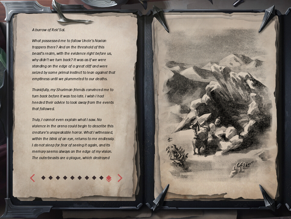 真的,我无法解释我看到的东西。竞技场中的激烈对战根本不足以形容这个生物的无言恐惧。我所目击的东西,在一眨眼的功夫里,就不断地回到我的记忆中。我没有睡觉,害怕再次看见它,并且它的记忆似乎总在我的视野边缘上。这些异界野兽是一场灾难,摧毁了这些地方,而雷克塞是死亡的化身。
