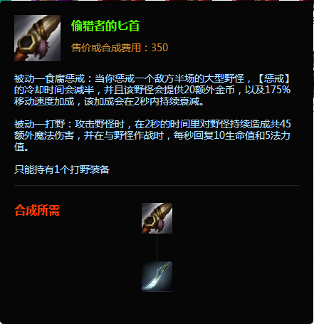 偷猎者的匕首,适合清野速度快,自带减速技能的的食草性打野。比如说努努这样的英雄,偷完就跑配合自己的E减速W加速对方打野就算是看见了你在偷野也只能看着你潇洒离去。但是在前期这个装备的作用对于强势的食肉打野也是有用的。如果你绕开敌方的视野并且成功惩戒掉了对方的buff,对方十有八九要撤,而这时2秒的移动速度加成就足够你追上他进行输出。在游戏的中期配合透视墙体的效果或者是在野怪身边的视野可以惩戒完对方的野怪就跑。回到家惩戒CD又可以支持你打完自家的buff。