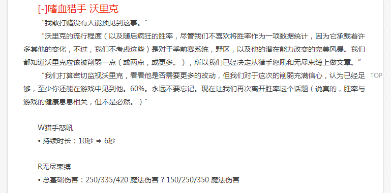 就单单论R的伤害,由于狼人的R会触发5次攻击被动,再结合削弱的伤害,很简单的就可以计算出直接性的减少了175的魔法伤害,就是削弱了狼人R的40%伤害,直接导致的结果就是狼人并不能RQ再接几下普攻就带走一个C位。不过,狼人无伤打野的情况并没有改变,再加上R的压制效果并没有削弱,所以狼人还是很强势的打野英雄。