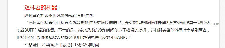 这对于职业打野来说是一个致命的改动,由于职业玩家补刀的技术摆在那里,所以打野跟线上的经济差距会更加的大,为了弥补差距,更快的清野是一个很重要的因素,曾经这个紫色的打野道具对于清野的效率提升大部分就在这15s的冷却上,毕竟60秒跟45秒的差距不可谓不大。虽然依旧有范围伤害和眩晕以及一定的回复,但移除冷却减免,就是实打实的降低打野效率。
