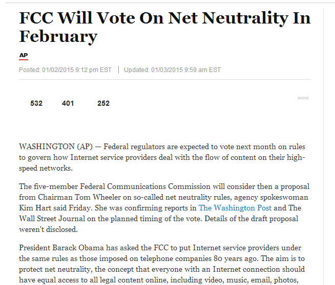美国众议院将在2月份举行投票,关于是否限制ISP(互联网服务提供商)**公私及个人·进行表决。这项投票由FCC全称美国联邦通讯委员会(Federal Communications Commission)发起,名为Net Neutrality(网络平等),目的在于消除大公司与小公司以及个人之间的不平等待遇,以前ISP会将优质资源供给大型公司诸如亚马逊,Netflix等,但现在FCC想要给全民提供一个平等中立的互联网服务。